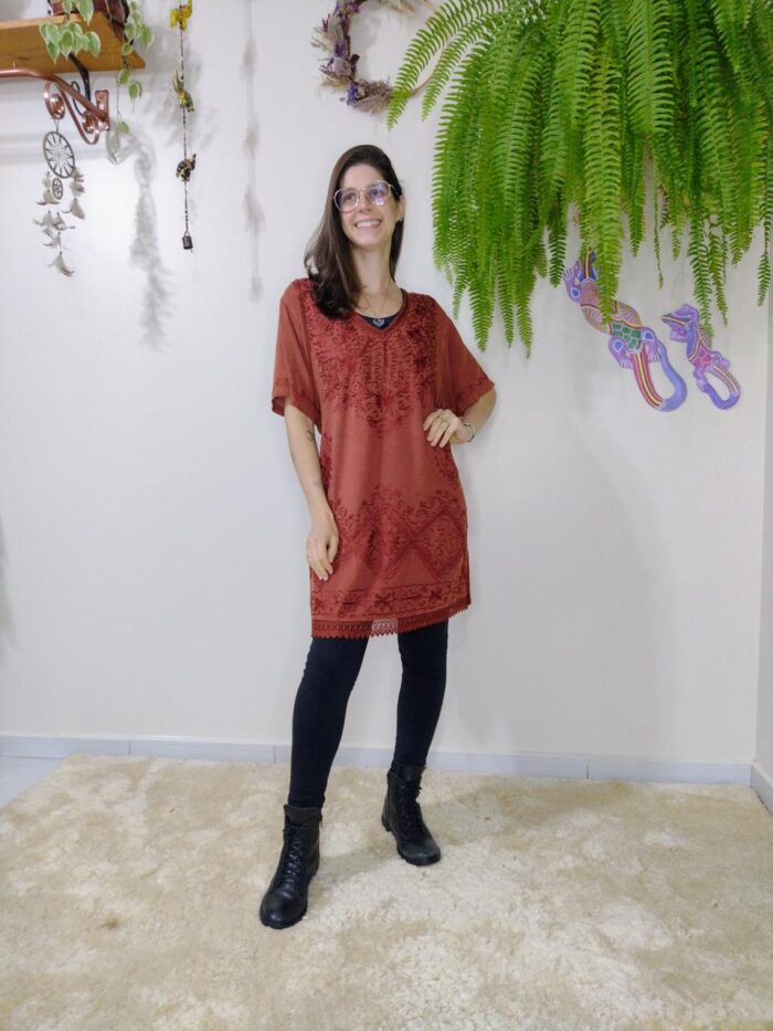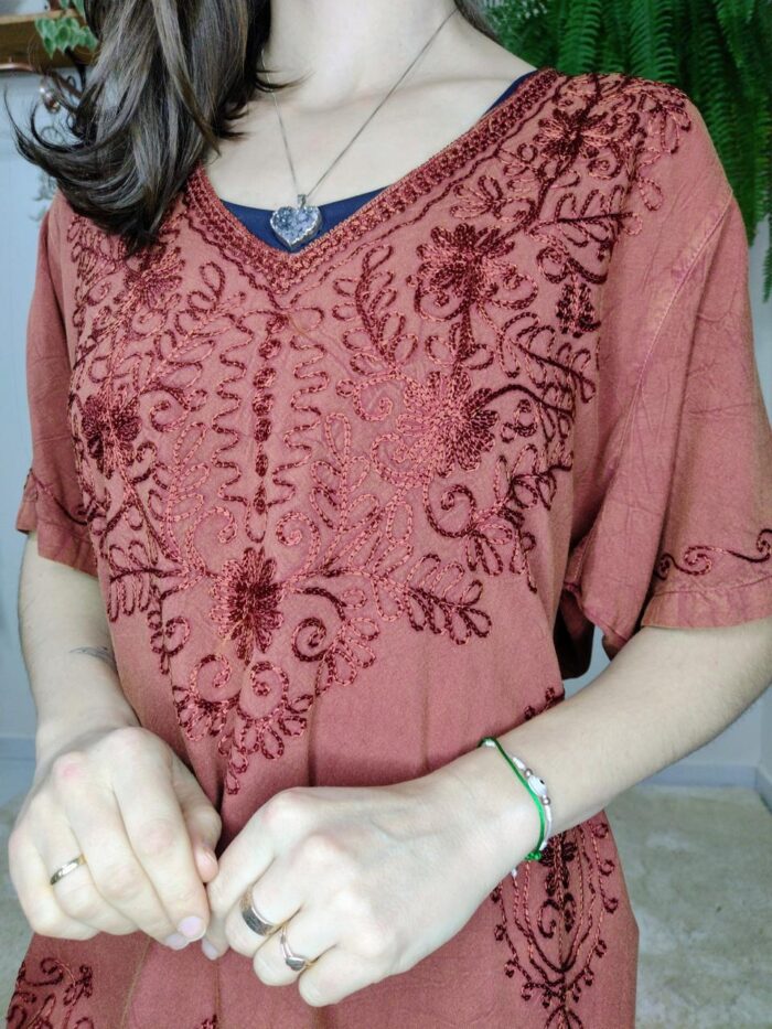A bata indiana em tecido viscose é uma peça leve, macia e confortável, ideal para uso prolongado em dias quentes por sua respirabilidade e toque suave. Apresenta um caimento fluido que valoriza o corpo com elegância, sem o peso do tecido pesado