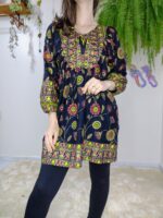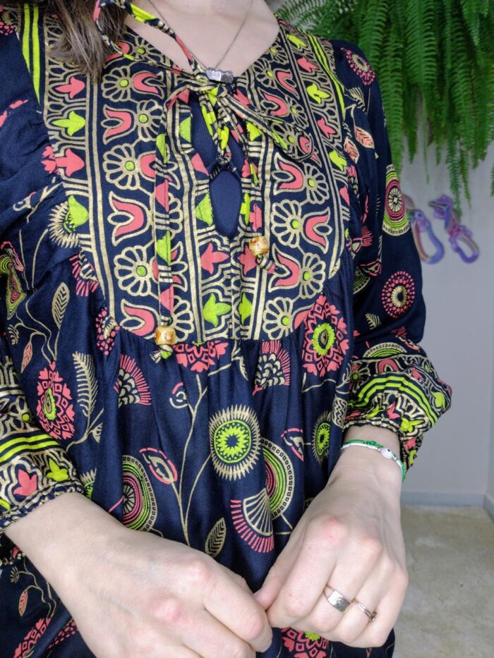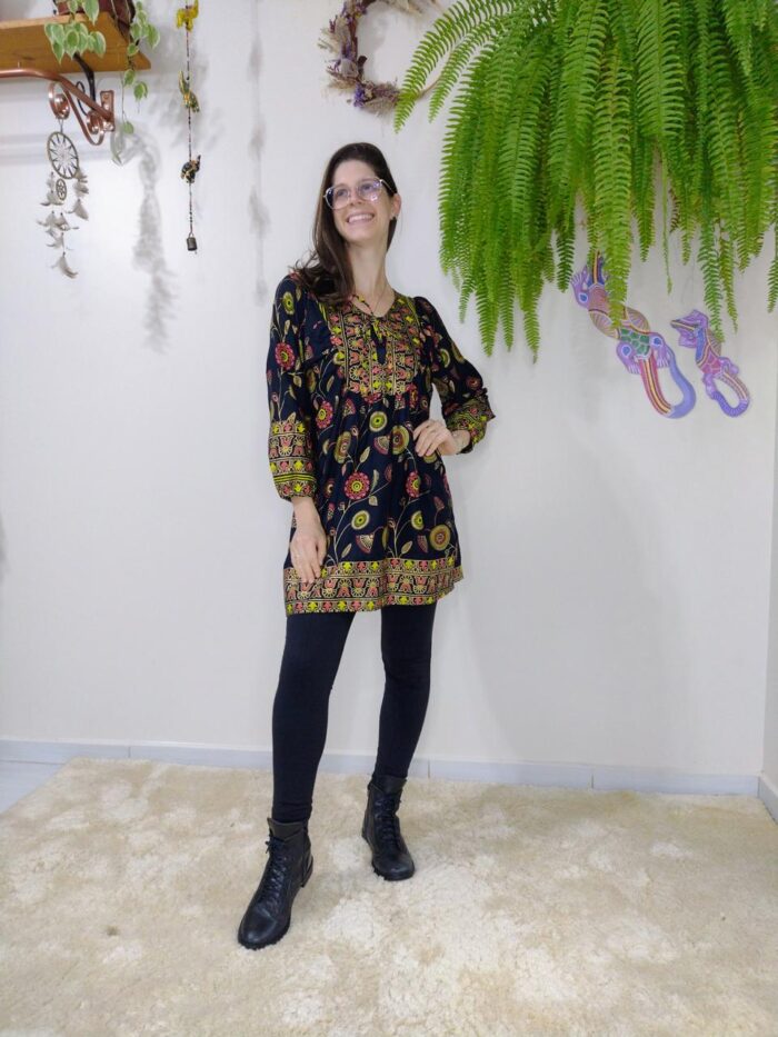 A bata indiana em tecido viscose é uma peça leve, macia e confortável, ideal para uso prolongado em dias quentes por sua respirabilidade e toque suave. Apresenta um caimento fluido que valoriza o corpo com elegância, sem o peso do tecido pesado