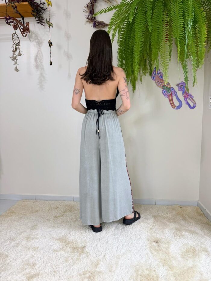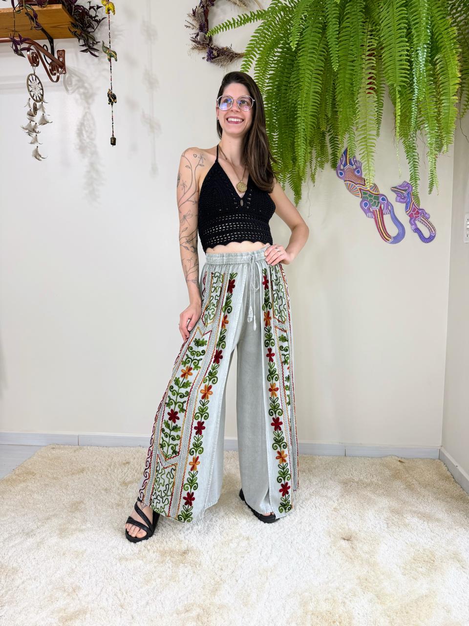 O elástico na cintura proporciona um ajuste perfeito e valoriza a cinturinha, enquanto o bordado dá um charme extra ao look Hippie Chic. Versátil e elegante, a Calça Estonada pode ser combinada com cropped, camisas amarradinhas ou T-shirts, permitindo que você explore e crie diferentes estilos.