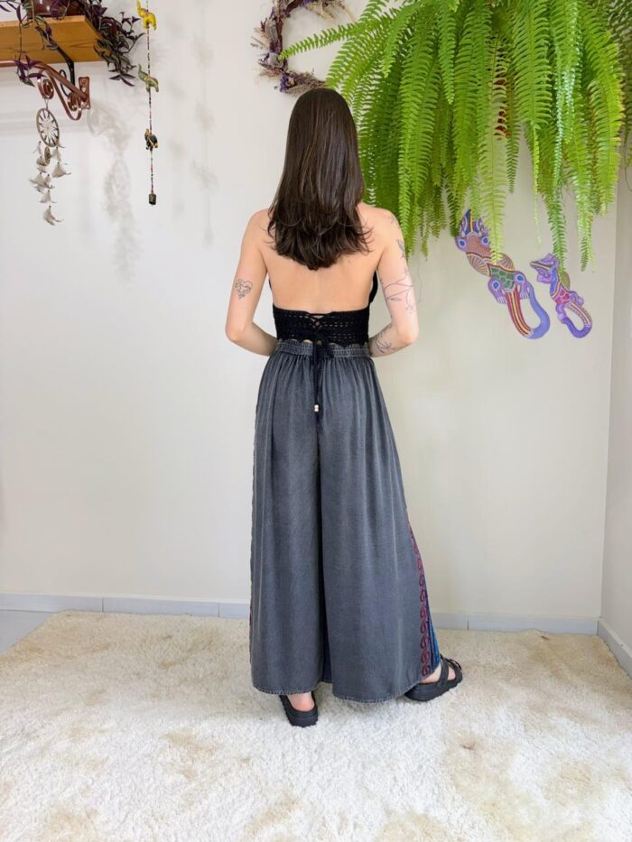 O elástico na cintura proporciona um ajuste perfeito e valoriza a cinturinha, enquanto o bordado dá um charme extra ao look Hippie Chic. Versátil e elegante, a Calça Estonada pode ser combinada com cropped, camisas amarradinhas ou T-shirts, permitindo que você explore e crie diferentes estilos.