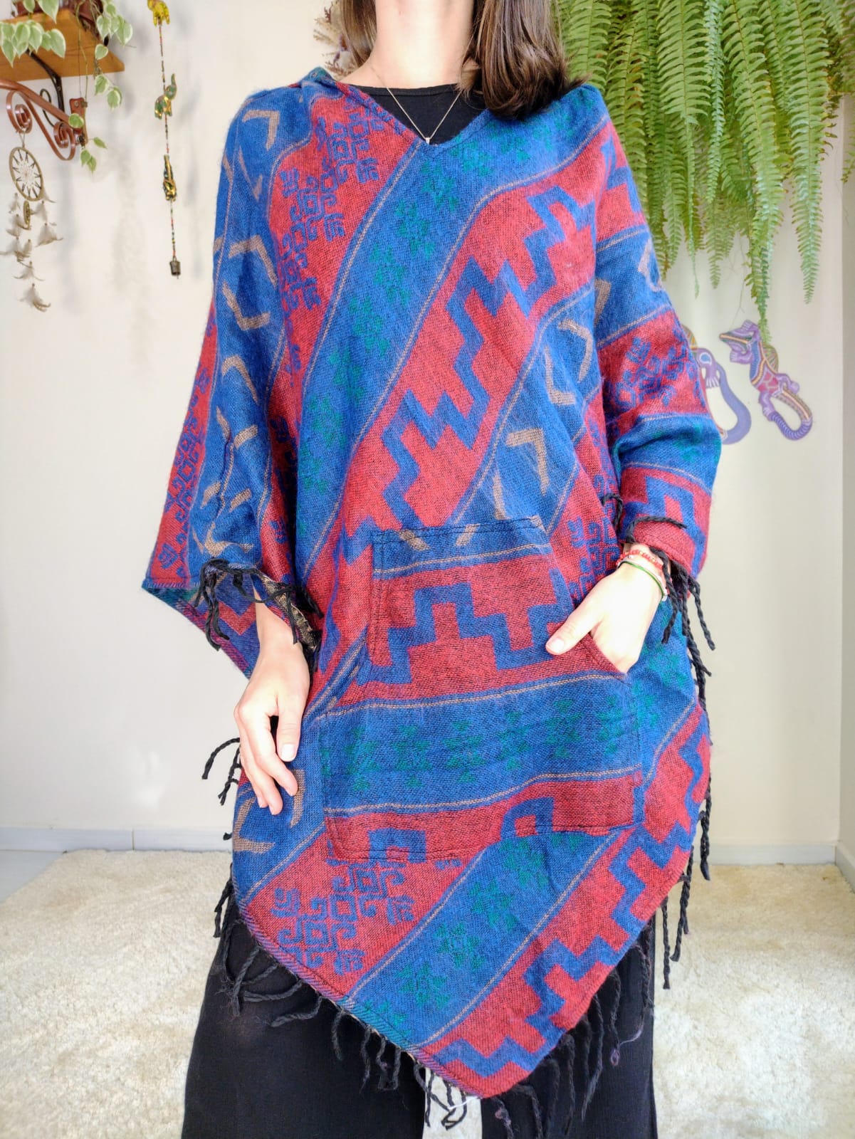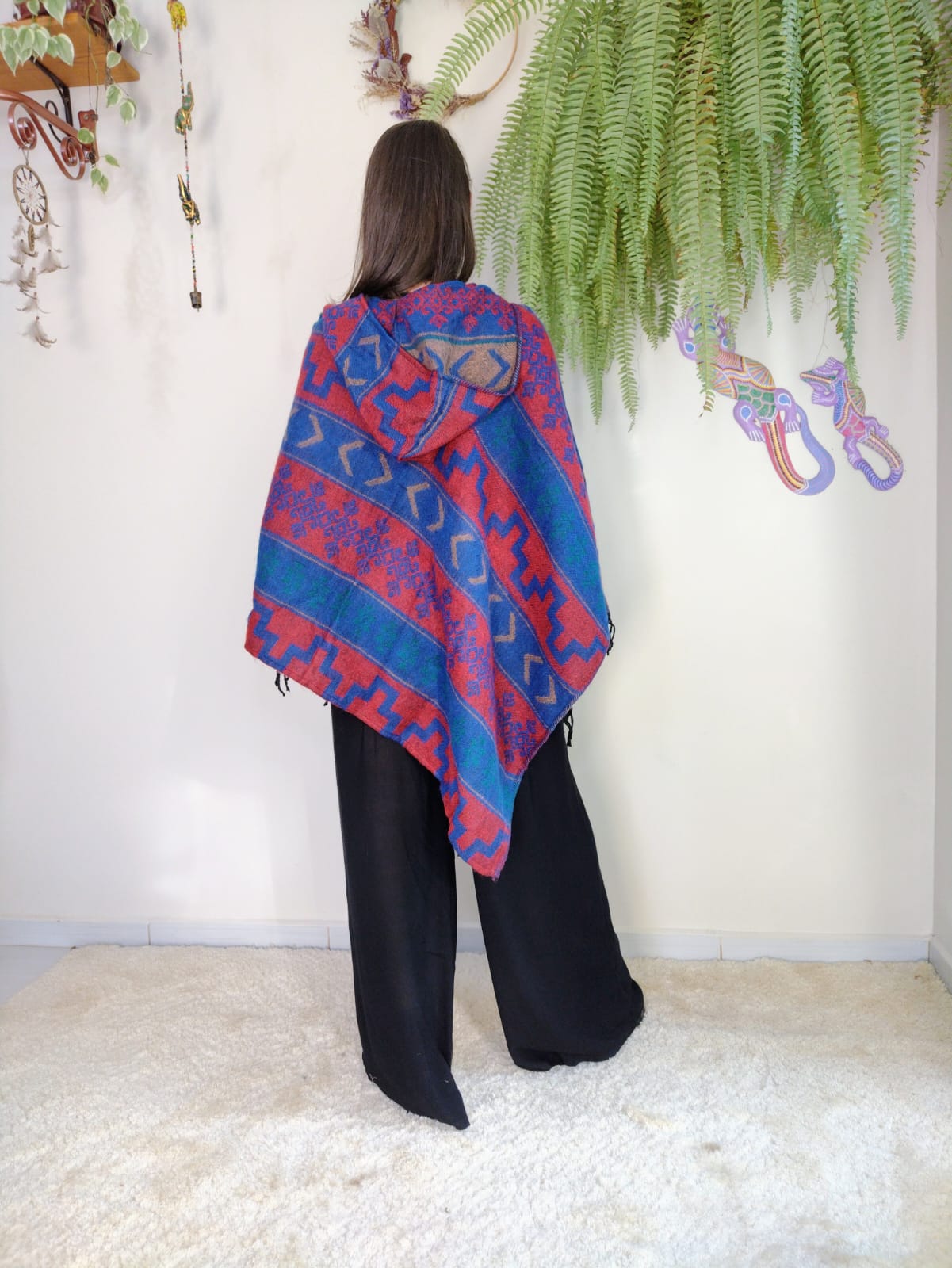 Eleve seu estilo com autenticidade e conforto usando este poncho peruano feminino, confeccionado em lã sintética.