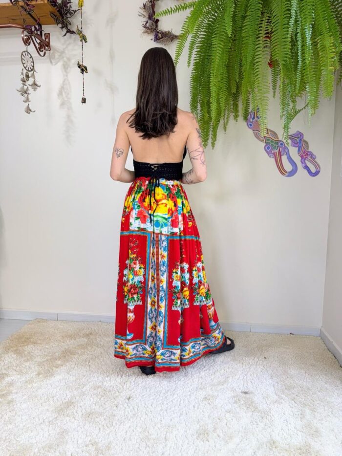 Saia longa feminina com design étnico e tecido leve, que oferece caimento fluido e conforto durante o uso. Conta com cintura elástica ajustável, que garante praticidade e ajuste perfeito ao corpo. Ideal para looks estilosos e versáteis, perfeito para ocasiões casuais ou para quem busca um visual boho chic.