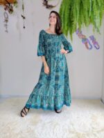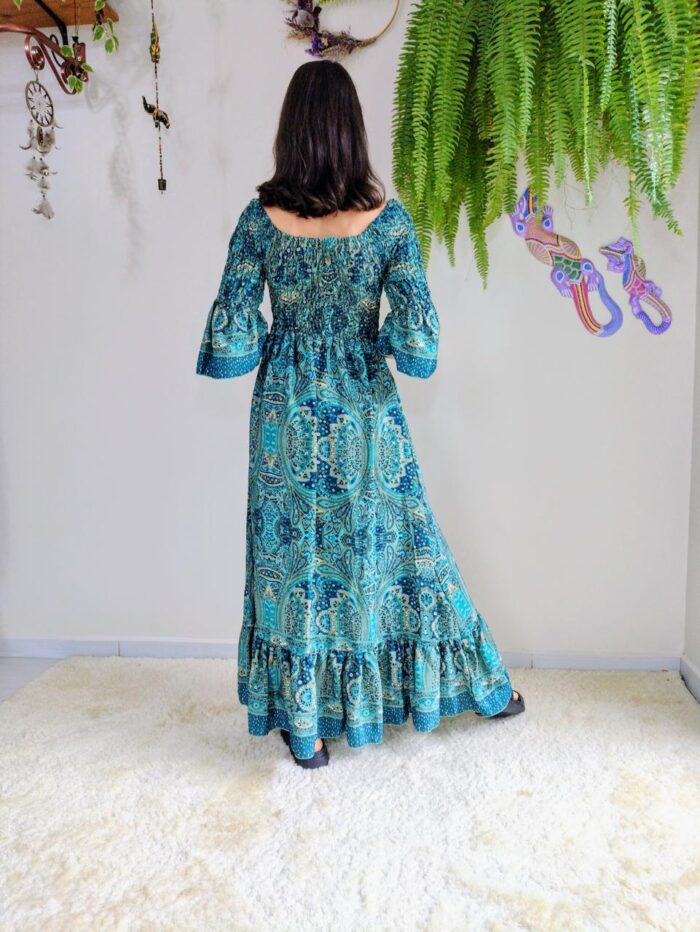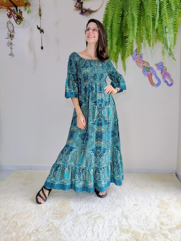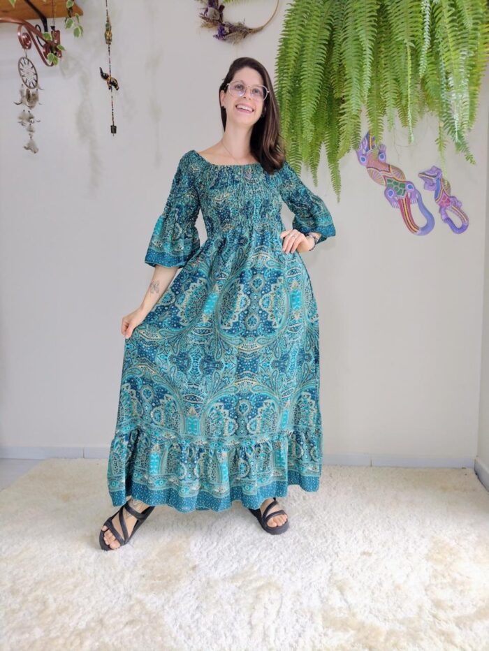 Nossos vestidos indianos possuem uma modelagem versátil, que se ajusta a mais de um tamanho.