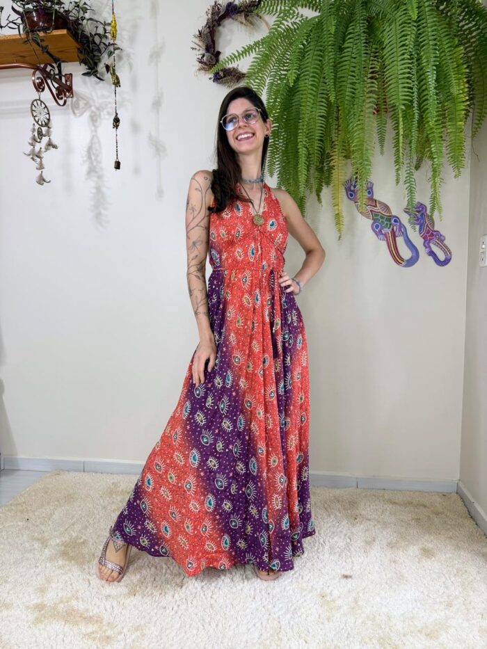 Este vestido longo em viscose é a peça perfeita para quem busca autenticidade e conforto, enquanto expressa sua essência única. Com cores marcantes que capturam olhares e regulagem nas costas para um ajuste personalizado, este vestido oferece não apenas estilo, mas também praticidade e versatilidade para o seu dia a dia.
