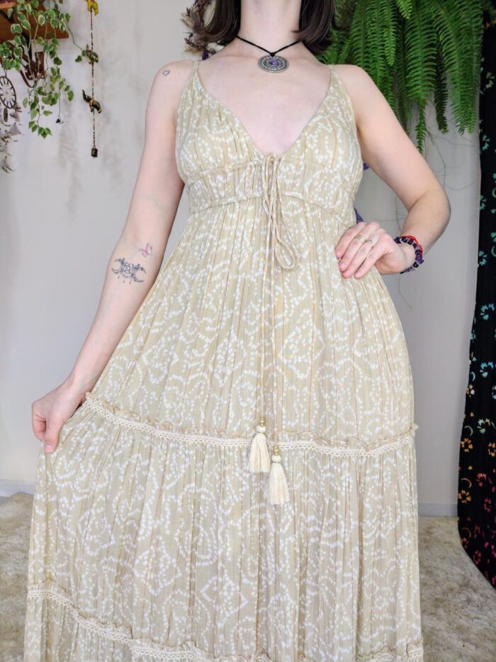 Vestido longo Eudora em tecido leve, perfeito para quem busca elegância e conforto em um só look. Com modelagem fluida e detalhes delicados, o vestido traz um estilo romântico que pode ser usado em diversas ocasiões, do dia a dia a eventos especiais. Sua estampa suave e cor neutra valorizam a beleza natural, enquanto o decote em V e as alças finasconferem um toque feminino e sofisticado. Ideal para quem deseja um visual versátil e estiloso, que une conforto e charme em cada movimento..